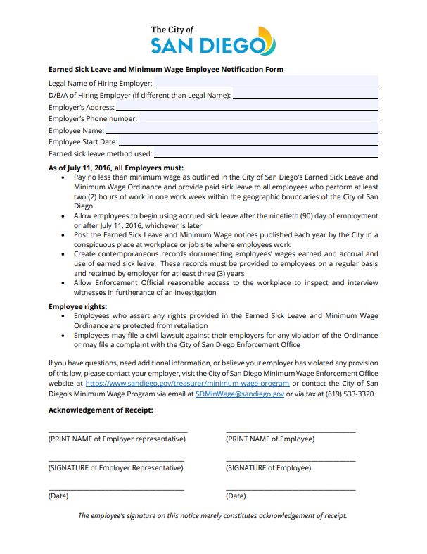 VIDEO- City of San Diego Minimum Wage and Earned Sick Leave yOUR rIGHTS AS A WORKER The California Department of Industrial Relations Labor Enforcement Task Force has created a comprehensive yet brief booklet with an overview of your rights as a worker. San Diego Minimum Wage Official Notice (English) Description San Diego Earned Sick Leave Official Notice (English) Description San Diego Employer to Employee Notice (English) Description California Minimum Wage Official Notice (English) Description Division of Labor Standards EnforcementPersonal Leave of Absence Description California Labor Commissioner's Office San Diego City Treasurer Division of Labor Standards Enforcement (DLSE) Publications Minimum Wage in California San Diego Minimum Wage Program