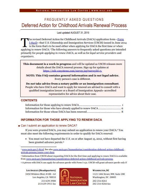 NILC Deferred Action for Childhood Arrivals (DACA) Renewal Process Description DACA and Workplace Rights Description Immigrants Rising: A guide to ITINs, EINs and Taxes Description Immigrants Rising: Basic Facts About Entrepreneurship Description NILC's Know Your Rights: Is it safe to apply for health insurance or seek health care? (English) Description IMMI Prescreen Questions To Understand Your Options Description